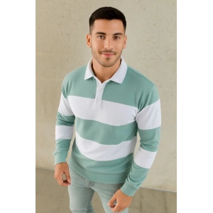 ERKEK POLO YAKA UZUN KOLLU ÇİZGİLİ SWEATSHİRT TREND RUGBY STİL - MİNT YEŞİLİ