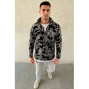 ERKEK TAM FERMUARLI DESENLİ POLAR SWEAT – SİYAH MULTİCOLOR FİGÜR DESEN YAKALI, UZUN KOLLU, OVERSİZE RAHAT KALIP- SİYAH