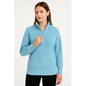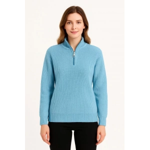 KADIN YARIM FERMUARLI TRİKO KAZAK – SELANİK ÖRGÜ, DİK YAKA, PAMUKLU DOKUMA, OVERSİZE UZUN KOLLU KIŞLIK MODEL - BEYAZ