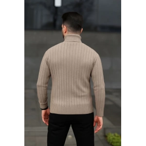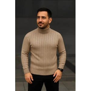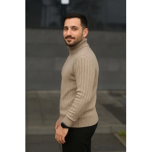 ERKEK BALIKCI YAKA BAĞAZLI TRİKO KAZAK PAMUKLU KALIN FİTİLLİ DOKUMA, REGULAR FİT UZUN KOLLU KIŞLIK MODEL - BEJ