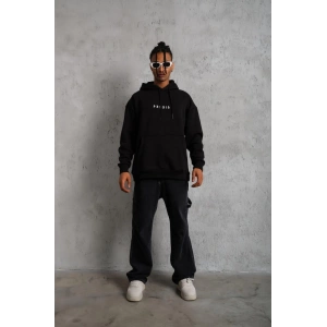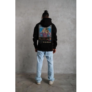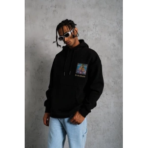ERKEK SIRT BASKILI KAPÜŞONLU ÜÇ İPLİK OVERSİZE SWEATSHİRT - SİYAH