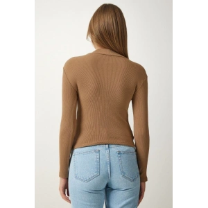 Kadın Kaşkorse Boğazlı Full Likralı Fitilli Body Kazak - Haki