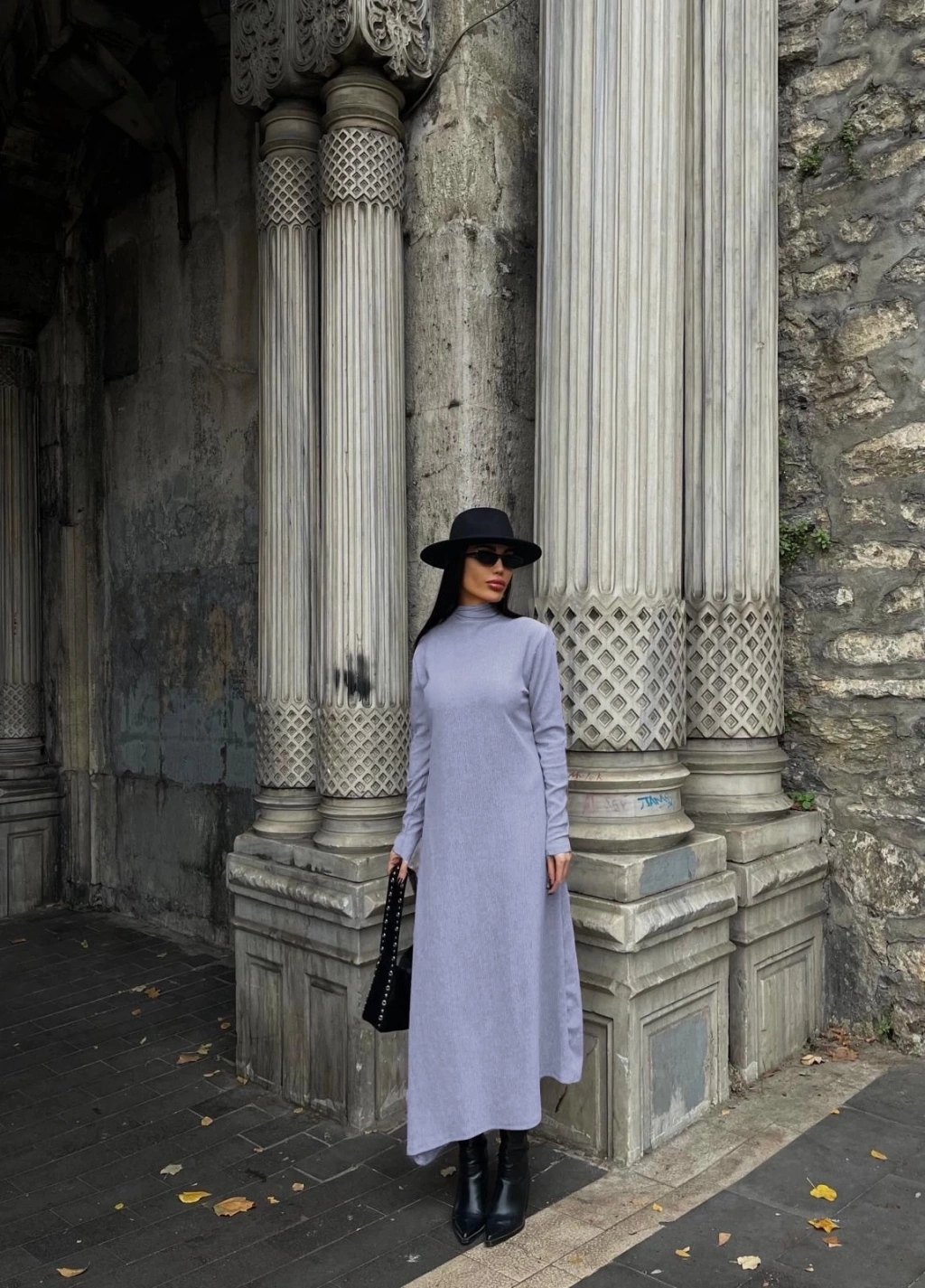 Boğazlı kalın bürümcük uzun elbise gri, hem şık hem de rahat bir seçenektir.