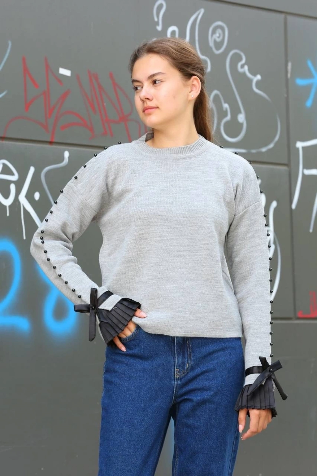 Desenli triko kazak gri