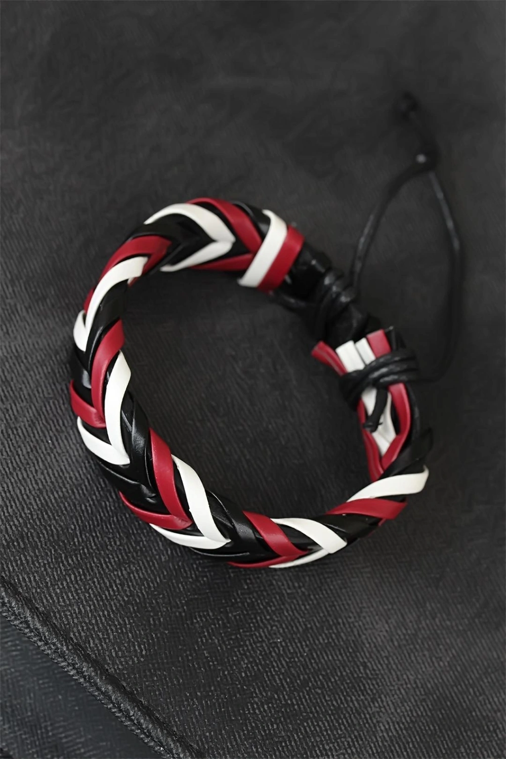 Bordo Beyaz Siyah Örgü Deri Erkek Bileklik