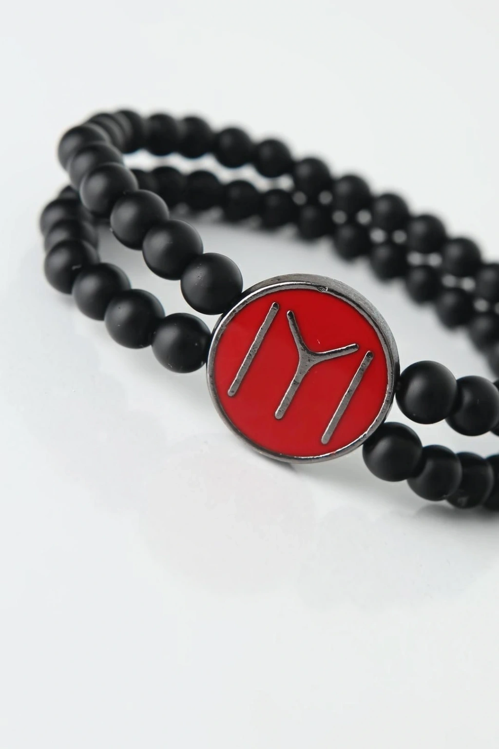 Bordo Renkli Metal Üzerine Füme Kayı Boyu Figürlü Siyah Renk Çift Sıra Doğal Taş Erkek Bileklik