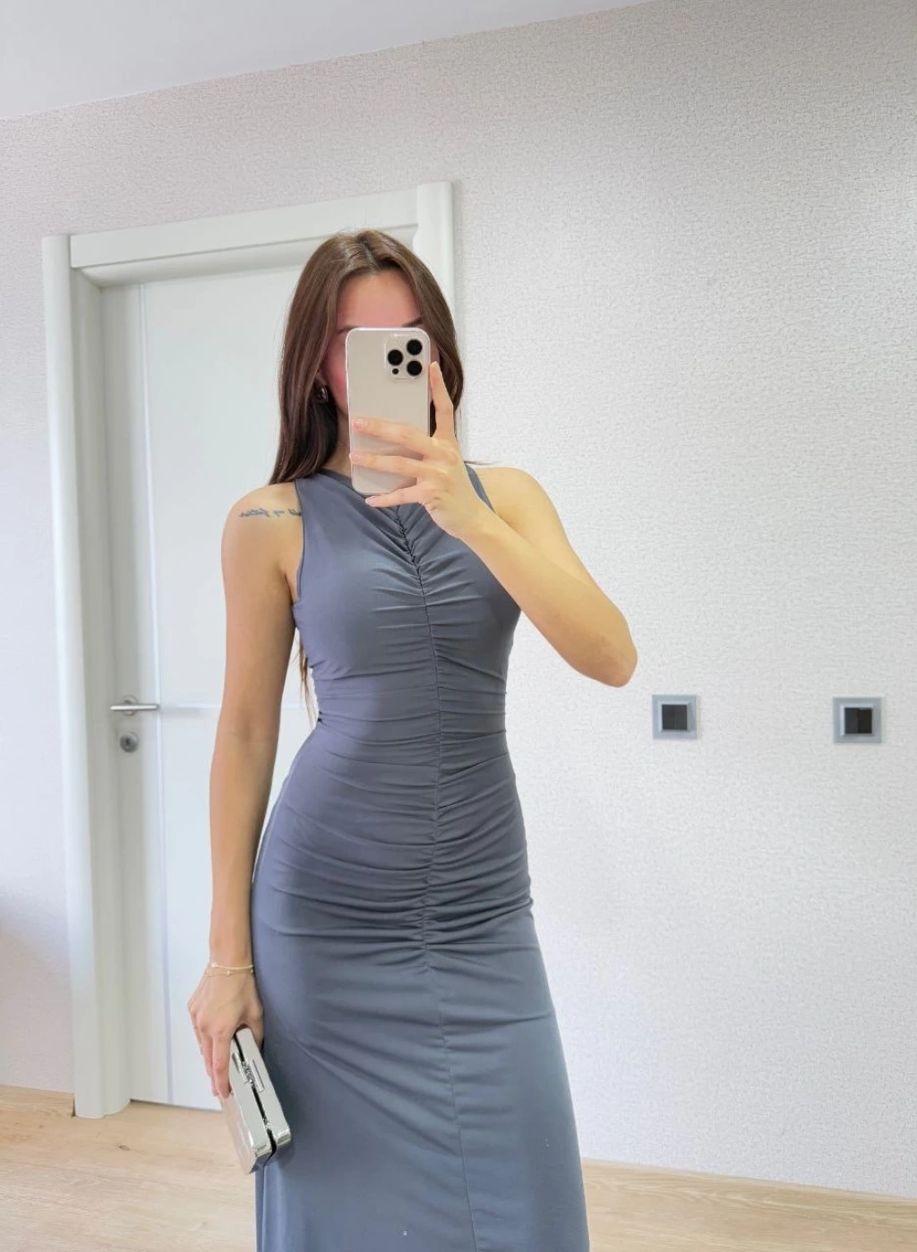 Kolsuz Yırtmaçlı Uzun maxı boy Elbise - Gri