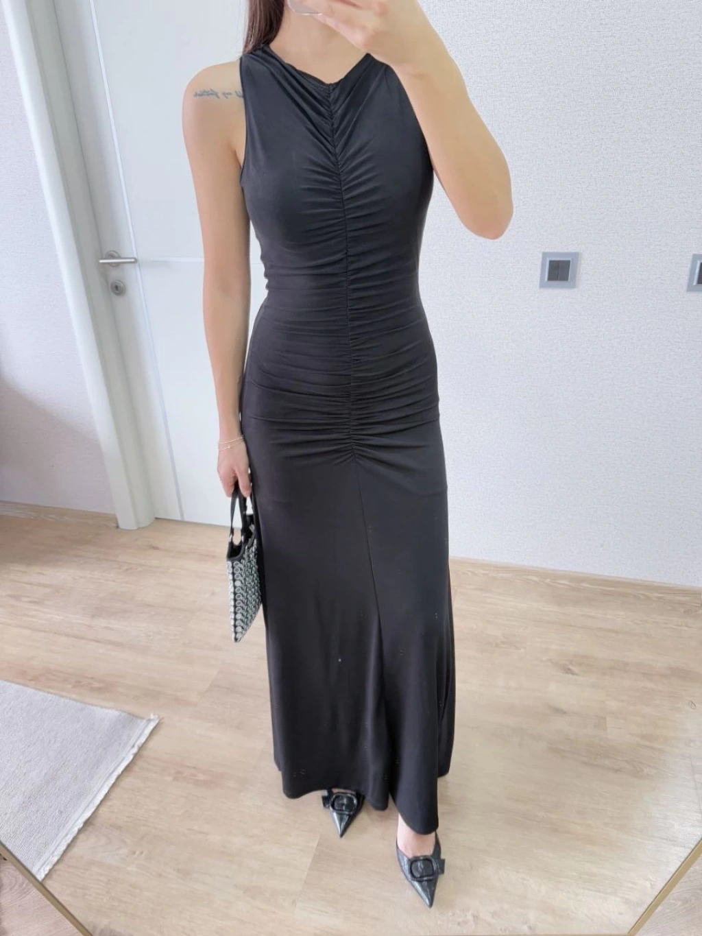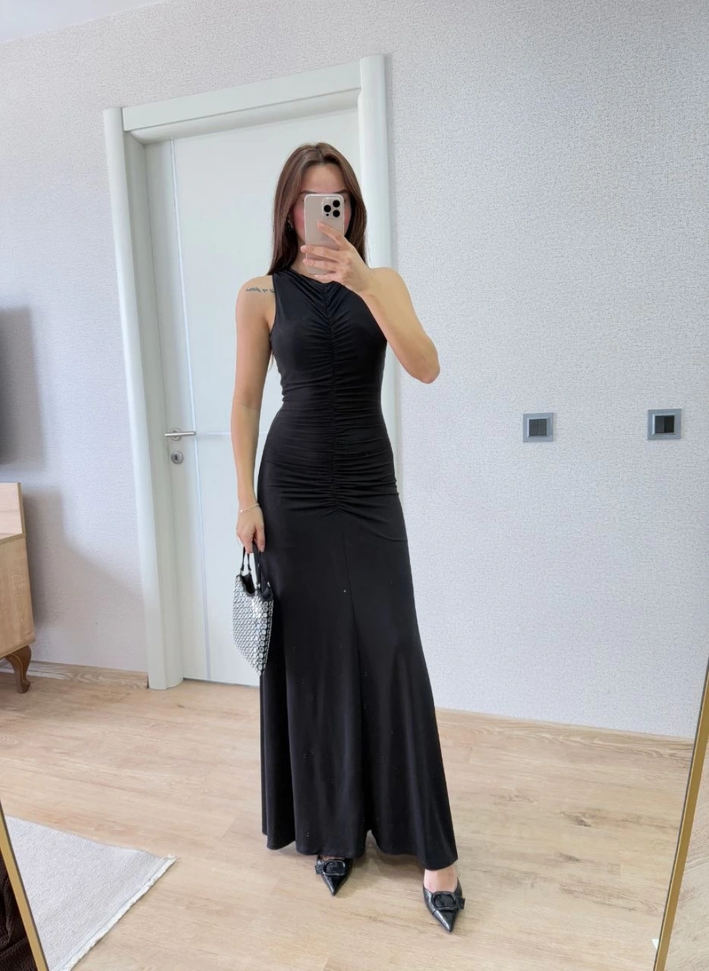 Sırt Bağlamalı Derin Yirtmaç Askılı Elbise - Siyah