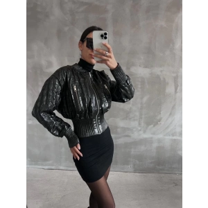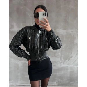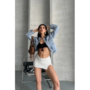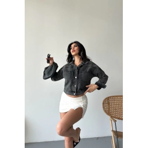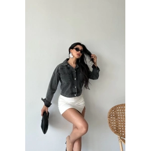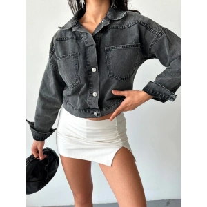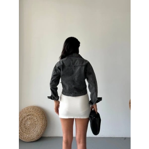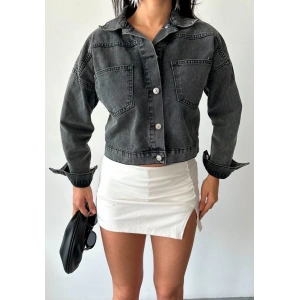Çift cepli kol katlamalı süper taş enzim yıkama crop kot ceket füme d2000