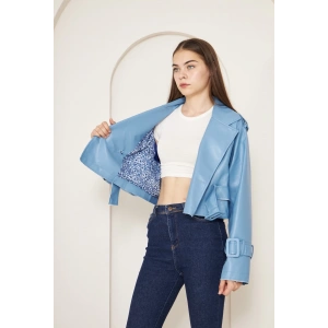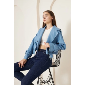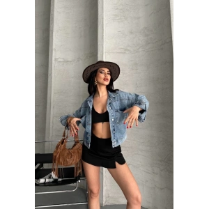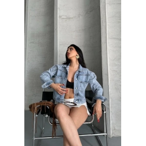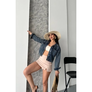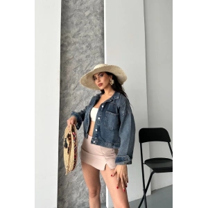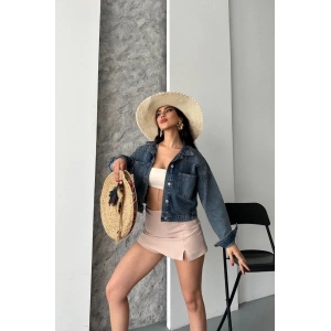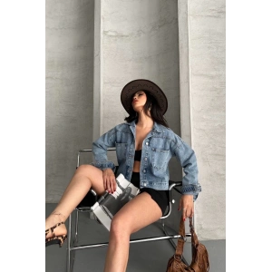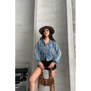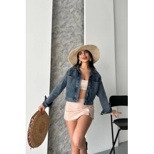 Çift cepli kol katlamalı kar yıkama crop kot ceket mavi d2000