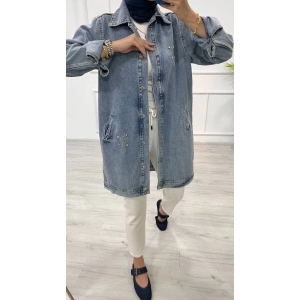 Taşlı tunik ceket kar yıkamalı mavi d2516