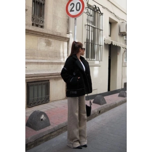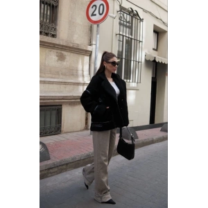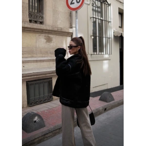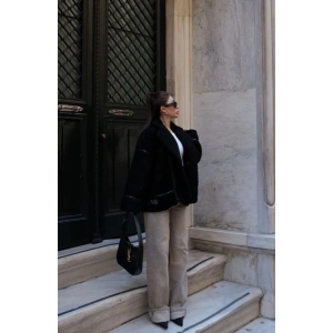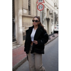 Cıt Cıt Detaylı Peluş Mont Ceket - Siyah