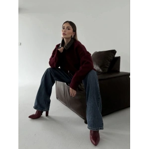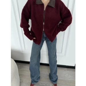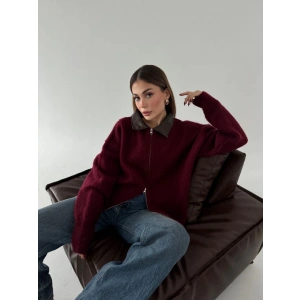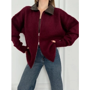 Deri Yakalı Pamuk dokulu Çift Taraflı Çalışan Fermuar Ceket - Bordo