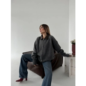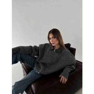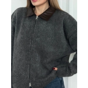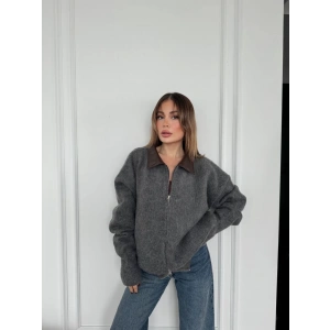 Deri Yakalı Pamuk dokulu Çift Taraflı Çalışan Fermuar Ceket - Füme