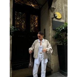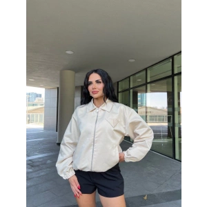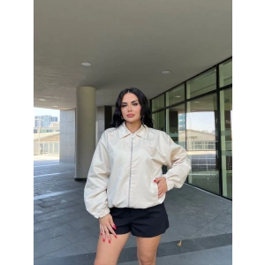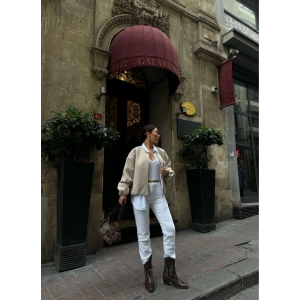 Fermuarlı Gömlek Yaka Bomber Ceket - Beyaz