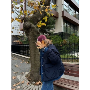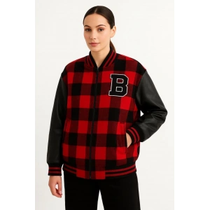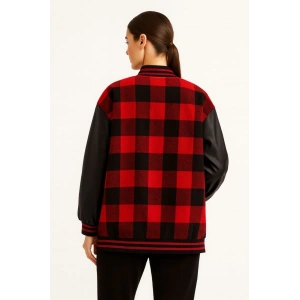 Kadın Kolej Ceket – Kareli Oduncu Kumaş, Kolları Suni Deri, Fermuarlı, İçi Kapitone Astarlı, Nakışlı Oversize Bahar & Kış Stil - Bordo