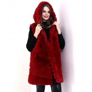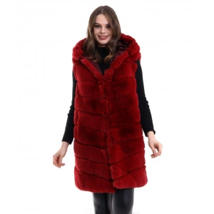 Kadın Kapşonlu Peluş Kürk Yelek Premium Kalite, Tam Astarlı, Uzun Model - Kırmızı