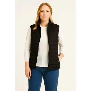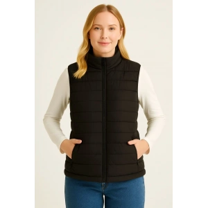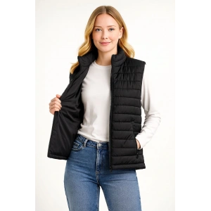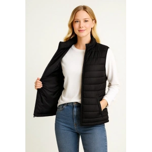 Kadın Şişme Fermuarlı Yelek Su itici Kapitone Astarlı Kumaş Cepli Hafif Kışlık Spor Rahat Kalıp - Siyah