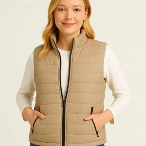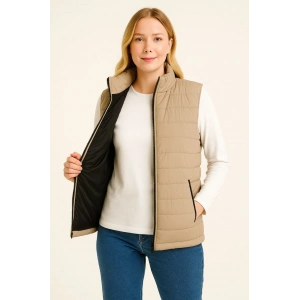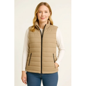 Kadın Şişme Fermuarlı Yelek Su itici Kapitone Astarlı Kumaş Cepli Hafif Kışlık Spor Rahat Kalıp - Bej