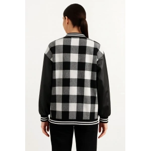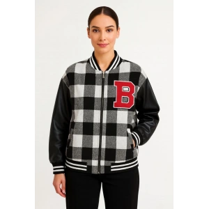 Kadın Kolej Ceket – Kareli Oduncu Kumaş, Kolları Suni Deri, Fermuarlı, İçi Kapitone Astarlı, Nakışlı Oversize Bahar & Kış Stil - Gri