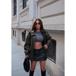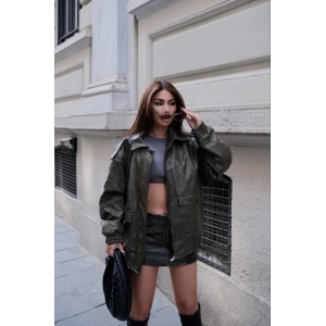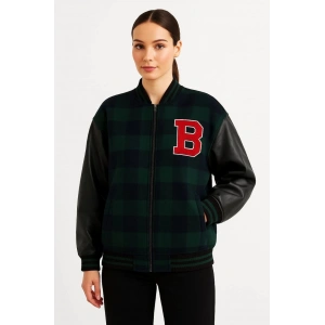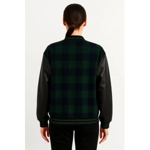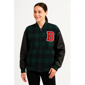 Kadın Kolej Ceket – Kareli Oduncu Kumaş, Kolları Suni Deri, Fermuarlı, İçi Kapitone Astarlı, Nakışlı Oversize Bahar & Kış Stil - Haki
