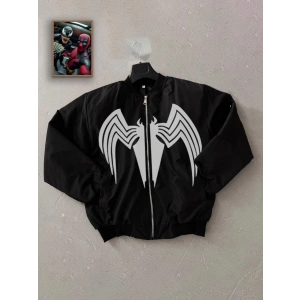 Unisex Siyah Bomber Mont – Venom Beyaz Örümcek Logolu, Fermuarlı Cepli, Kapitone Astarlı Günlük Mont - Siyah