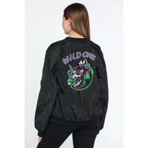 Kadın Wild One Baskılı Bomber Mont – Siyah Renk, Oversize Rahat Kalıp, Fermuarlı, Cepli, Günlük Şık Kapitone Mont - Siyah