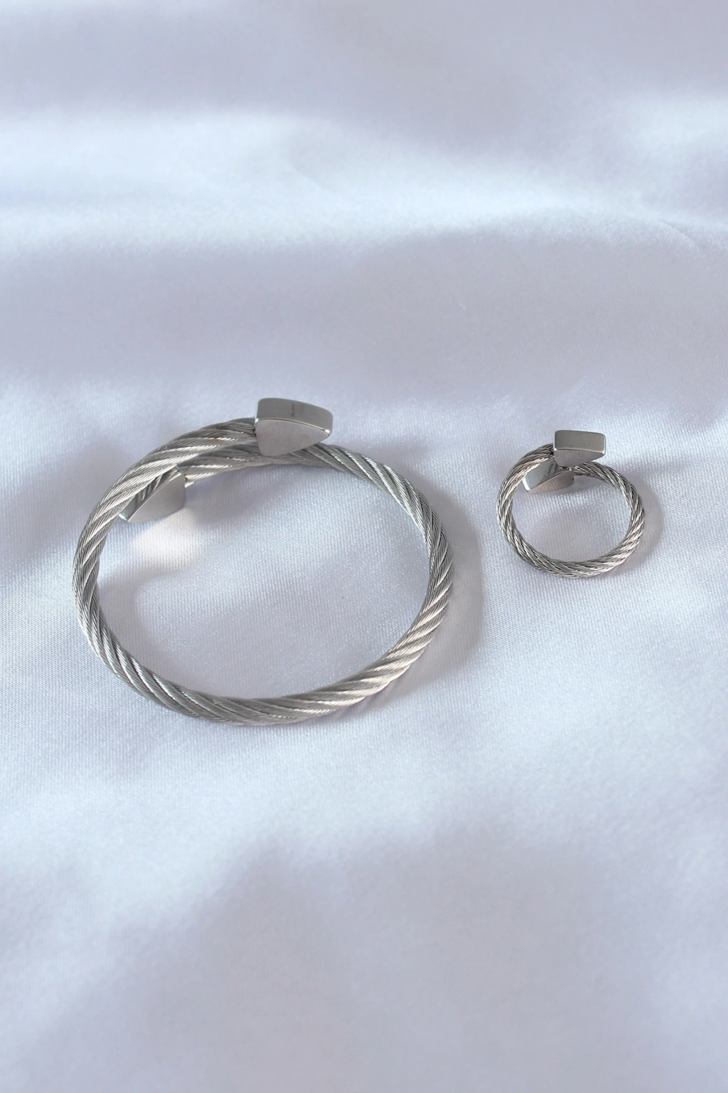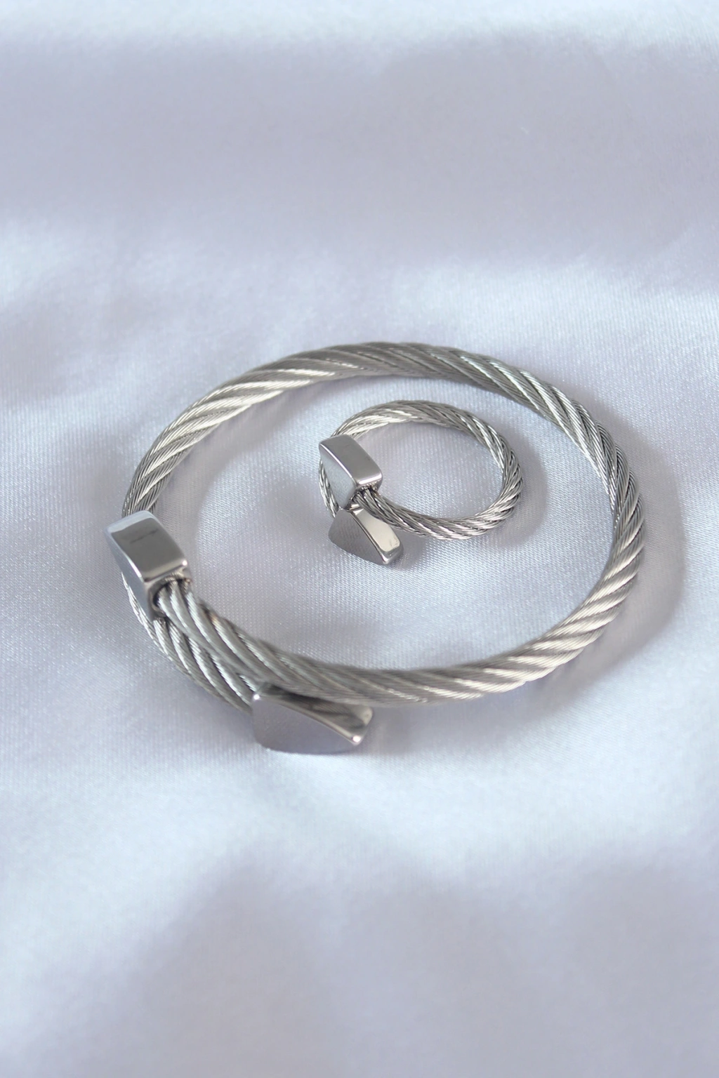 316L Çelik Gümüş Renk Oval Aksesuarlı Burgu Model Bileklik ve Yüzük Kombini