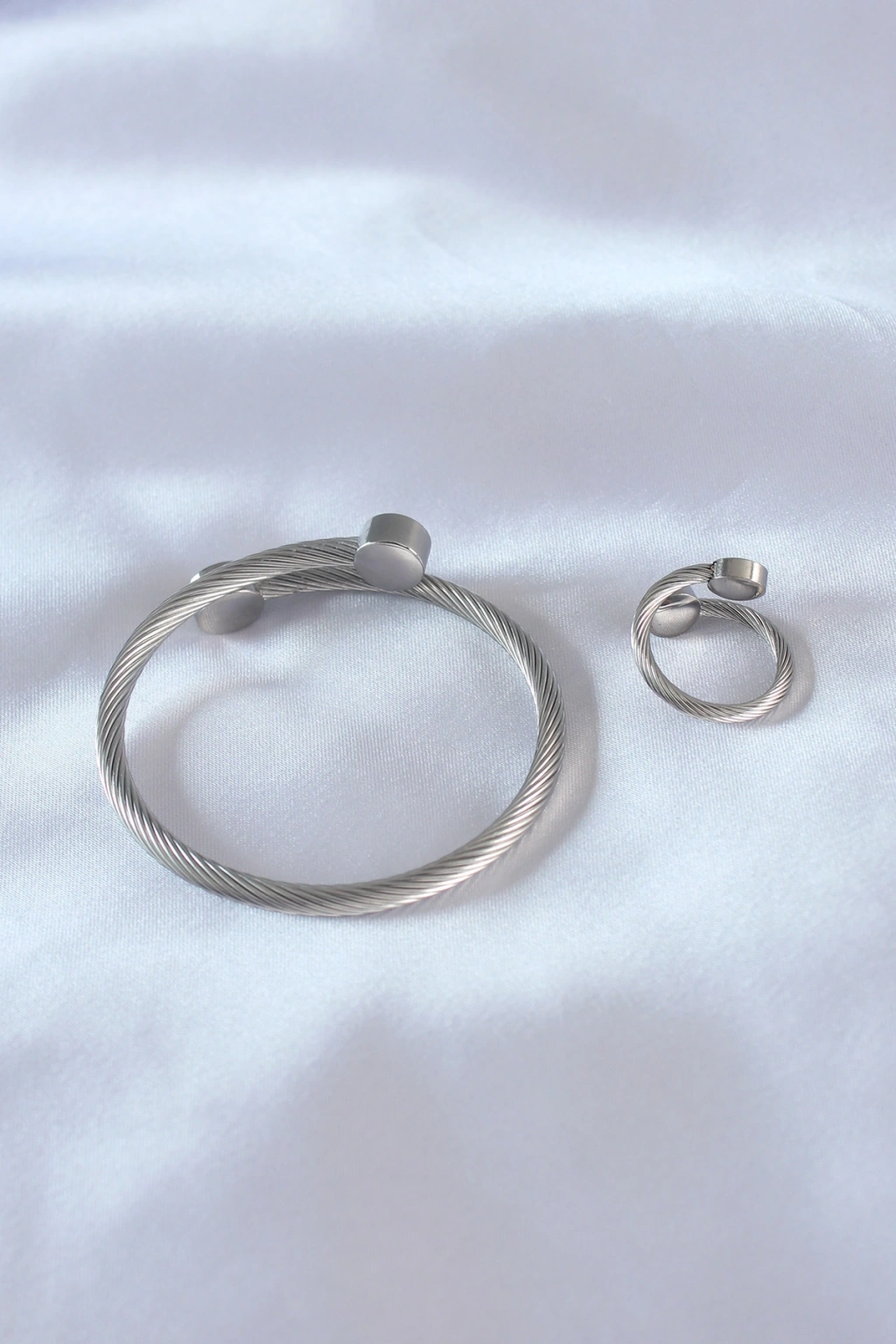 316L Çelik Gümüş Renk Sarmal Model Erkek Bileklik Yüzük Kombini