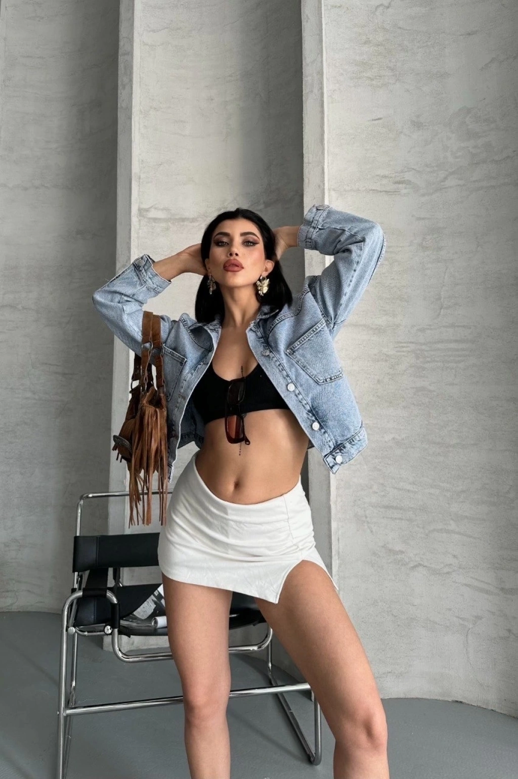 Tarzınızı yansıtan ve kombinlerinize şıklık katacak Çift Cepli Kol Katlamalı Kar Yıkama Crop Kot Ceket Mavi, gardırobunuzun vazgeçilmez parçalarından biri olmaya aday!