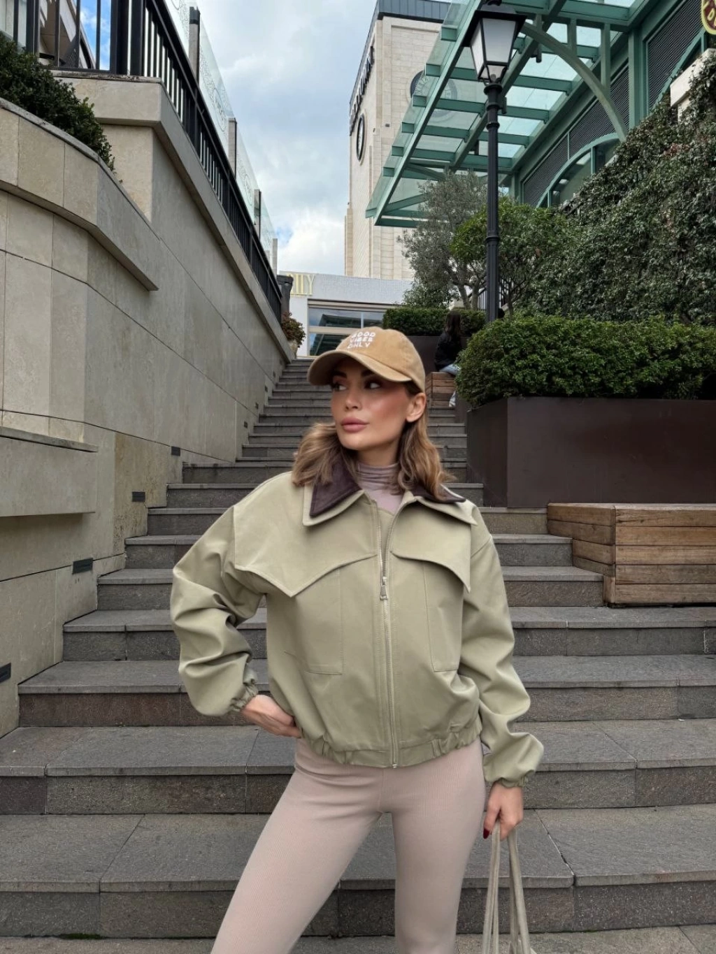 Kadın Kolej Ceket – Kareli Oduncu Kumaş, Kolları Suni Deri, Fermuarlı, İçi Kapitone Astarlı, Nakışlı Oversize Bahar & Kış Stil - Haki