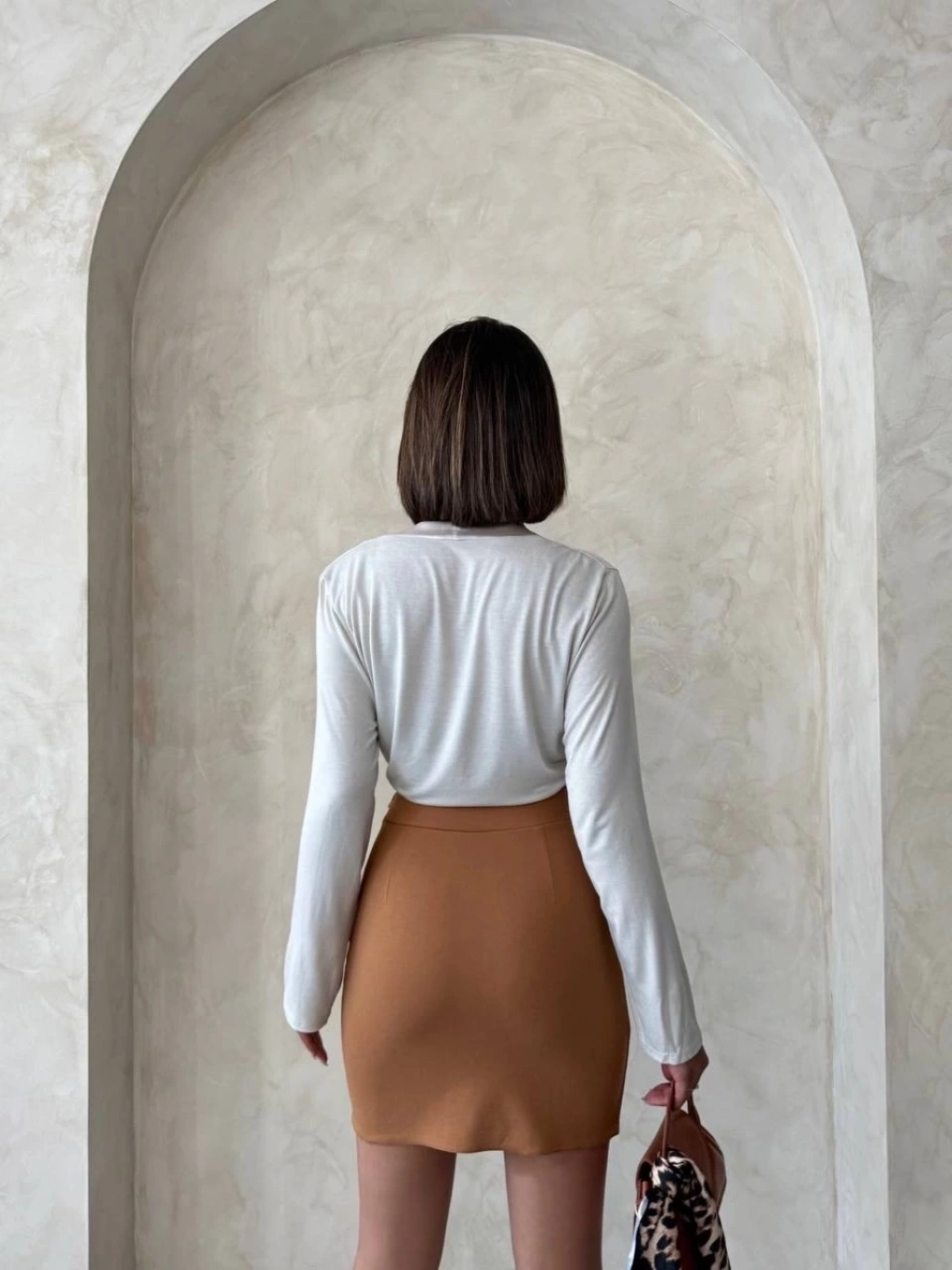 Çift yırtmaçlı etek camel s25910, şıklığı ve rahatlığı bir arada sunar.