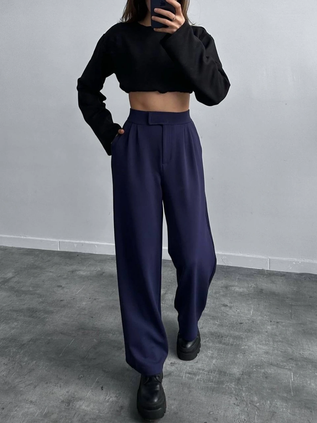 Yüksek bel kesimi sayesinde vücudu saran bu pantolon, konforlu bir kullanım vaat eder.
