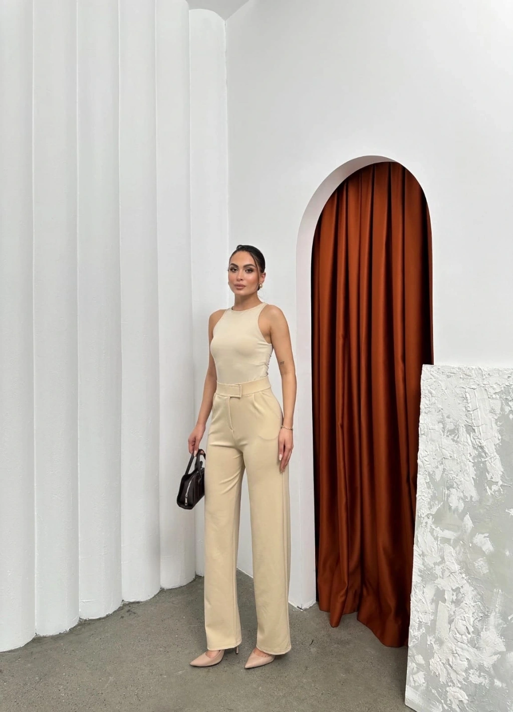 Dar paça kemerli kumaş pantolon kahve pt53