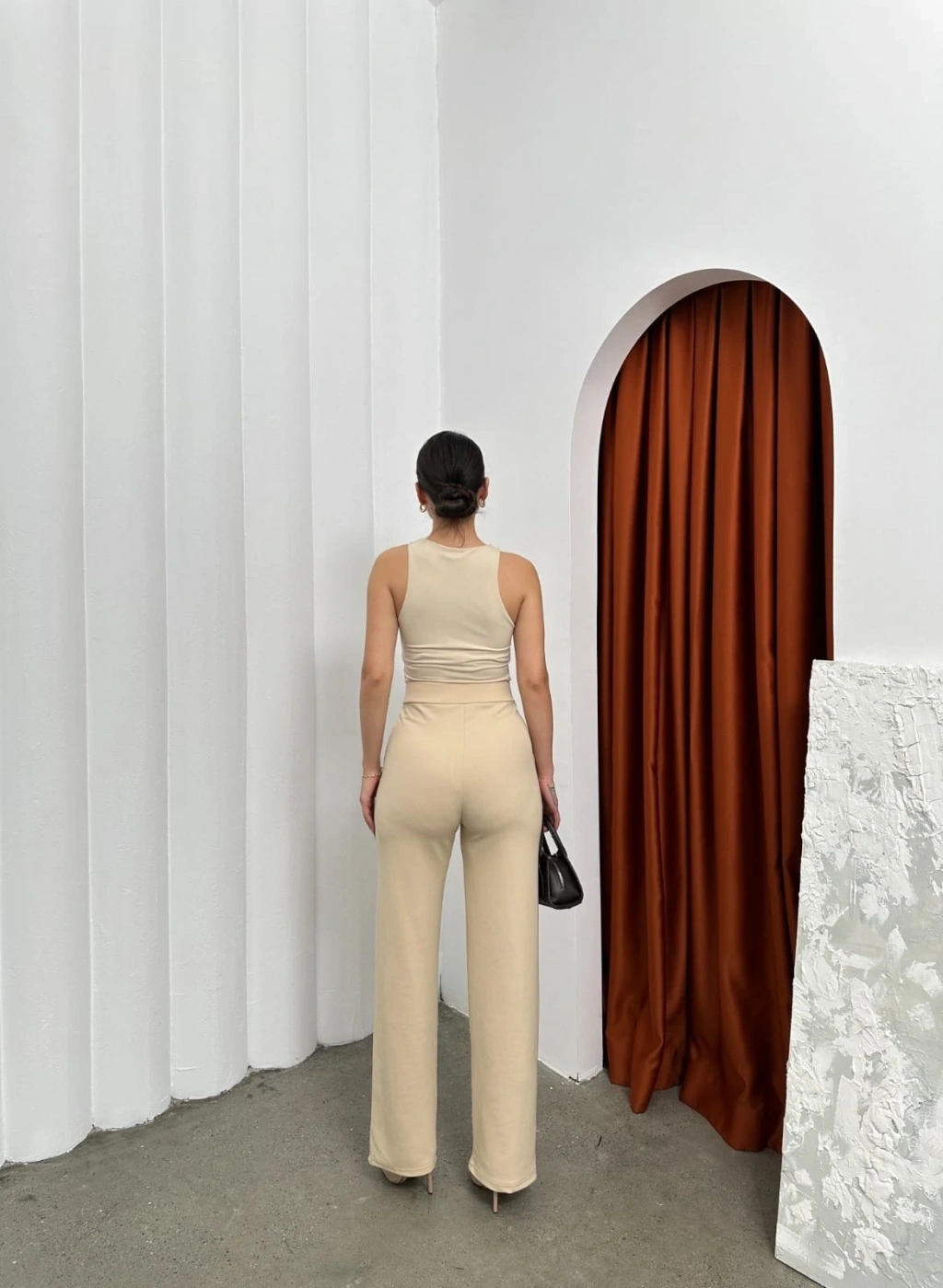 Şık ve rahat tasarımıyla dikkat çeken Krep Bej Cırtlı Pantolon, gardırobunuzun vazgeçilmez parçası olmaya aday!