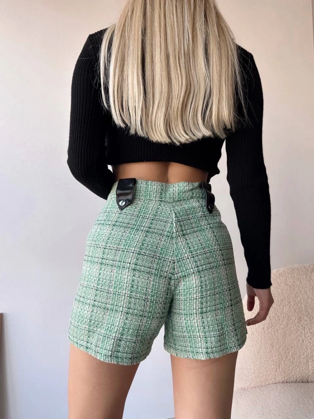 İki düğmeli kaz ayağı desen ch kumaş şort etek bordobeyaz h26414