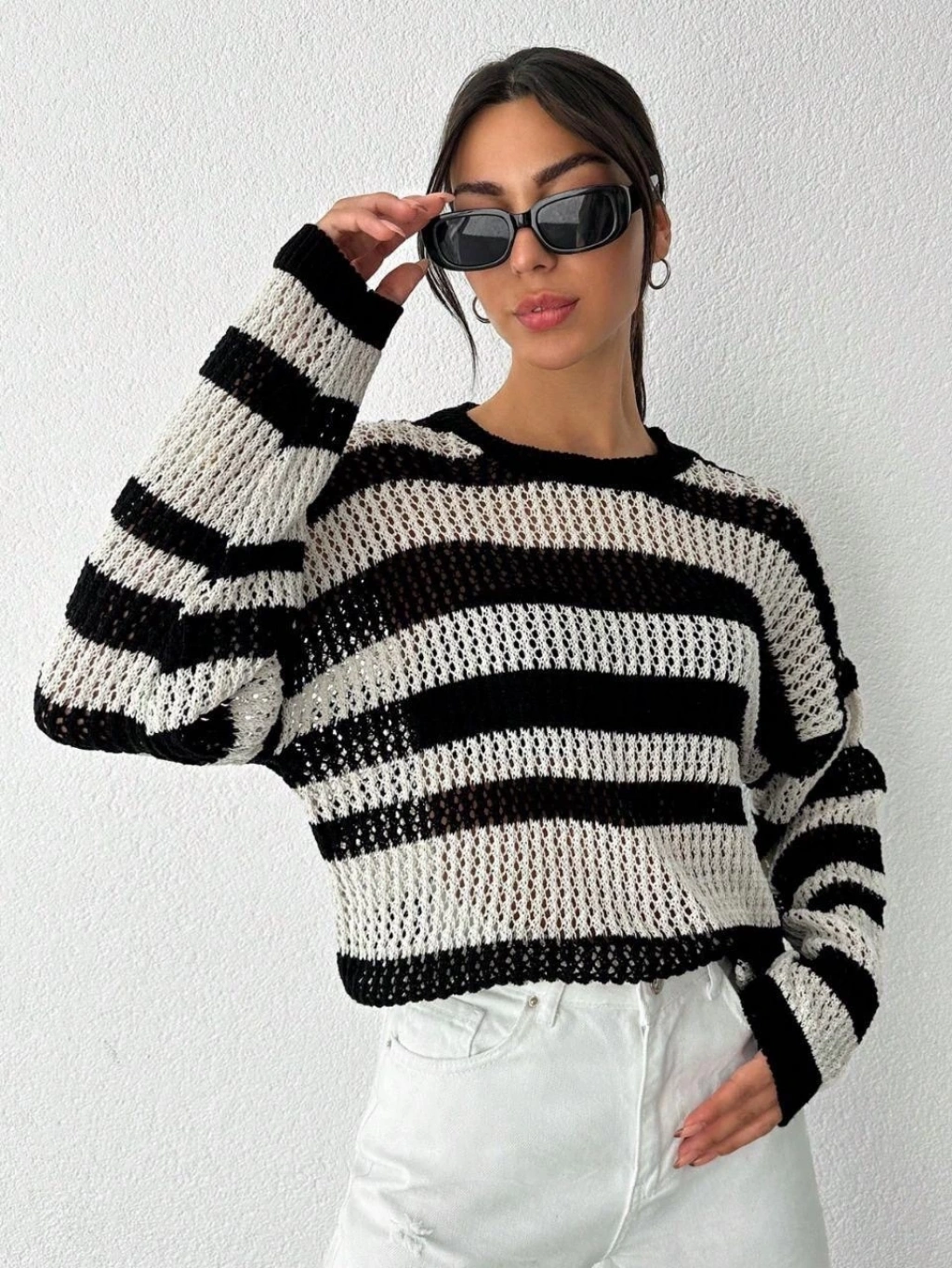 Çizgili ispanyol kol triko boğazlı kazak siyah elf