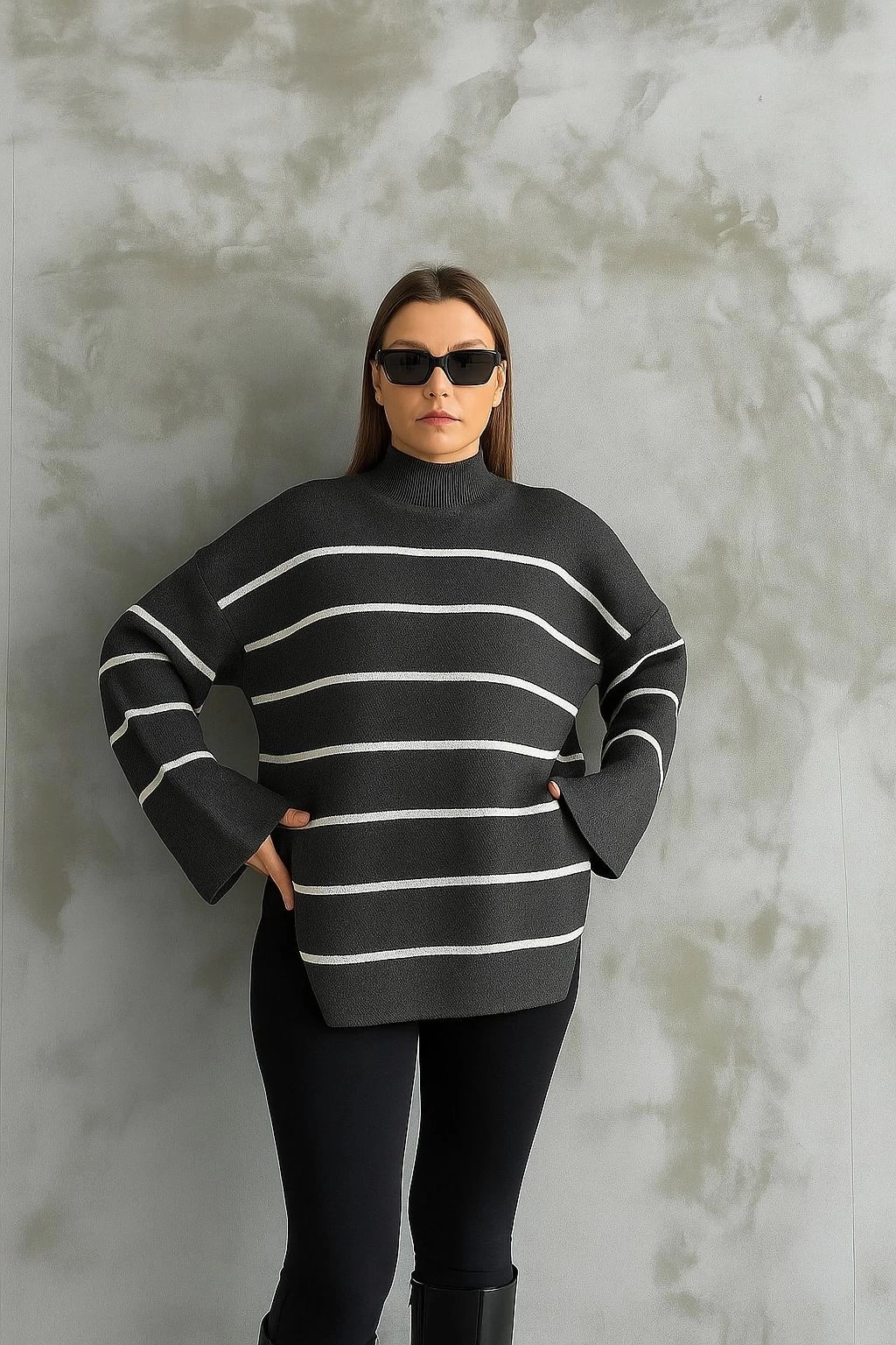 Çizgili İspanyol Kol Triko Boğazlı Kazak Antrasit Elf