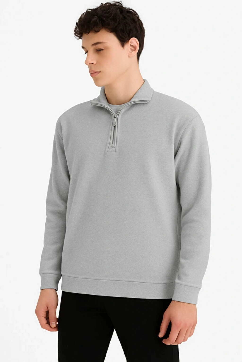 Yarım fermuar detayı ve dik yaka tasarımı, modern bir görünüm sunar, günlük kombinler için ideal bir tercih olur.
