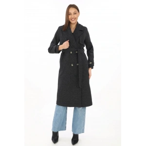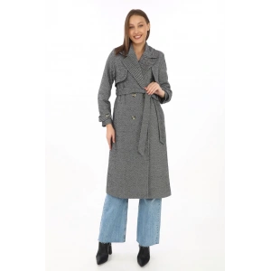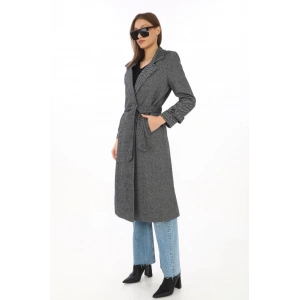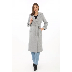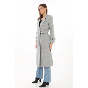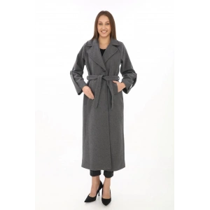 KADIN UZUN KAŞE KABAN – BALIK SIRTI DOKUMA KAŞMİR KUMAŞ, KRUVAZE YAKA, KUŞAKLI CEPLİ MODEL, OVERSİZE RAHAT KALIP - BOYALI GRİ