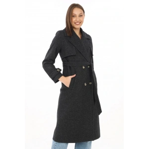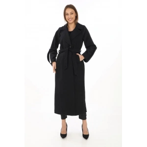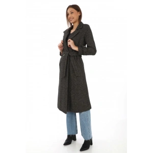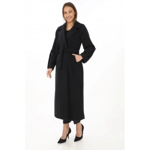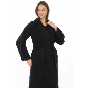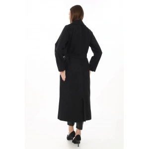 PREMİUM KADIN KAŞE KABAN UZUN BOY, BALIK SIRTI YÜNLÜ KAŞMİR DOKUMA, KRUVAZE KUŞAKLI ASTARLI - SİYAH