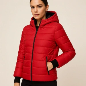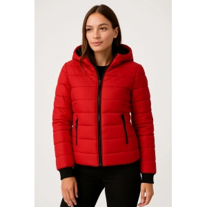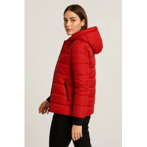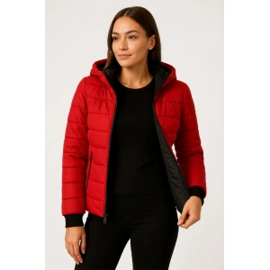 KADIN ŞİŞME KAPÜŞONLU FERMUARLI MONT SU İTİCİ KAPİTONE ASTARLI KUMAŞ CEPLİ KIŞLIK RAHAT KALIP - KIRMIZI
