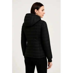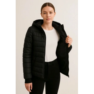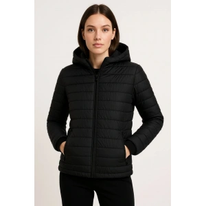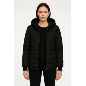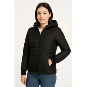 KADIN ŞİŞME KAPÜŞONLU FERMUARLI MONT SU İTİCİ KAPİTONE ASTARLI KUMAŞ CEPLİ KIŞLIK RAHAT KALIP - SİYAH