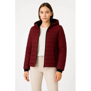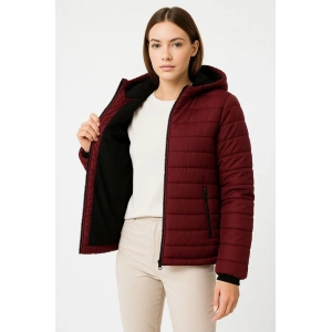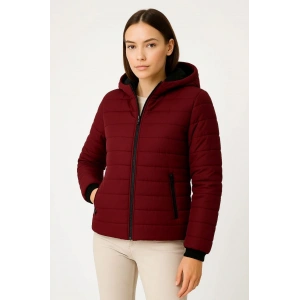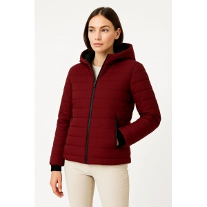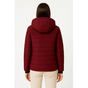 KADIN ŞİŞME KAPÜŞONLU FERMUARLI MONT SU İTİCİ KAPİTONE ASTARLI KUMAŞ CEPLİ KIŞLIK RAHAT KALIP - BORDO