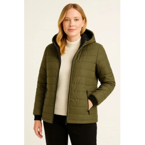 KADIN ŞİŞME KAPÜŞONLU FERMUARLI MONT SU İTİCİ KAPİTONE ASTARLI KUMAŞ CEPLİ KIŞLIK RAHAT KALIP - HAKİ