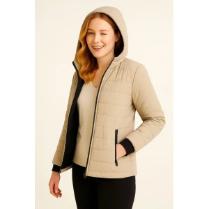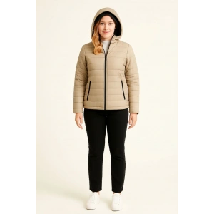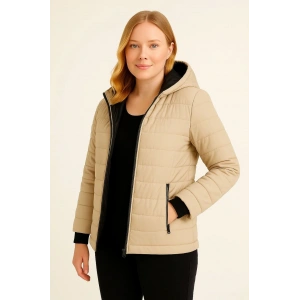 KADIN ŞİŞME KAPÜŞONLU FERMUARLI MONT SU İTİCİ KAPİTONE ASTARLI KUMAŞ CEPLİ KIŞLIK RAHAT KALIP - BEJ