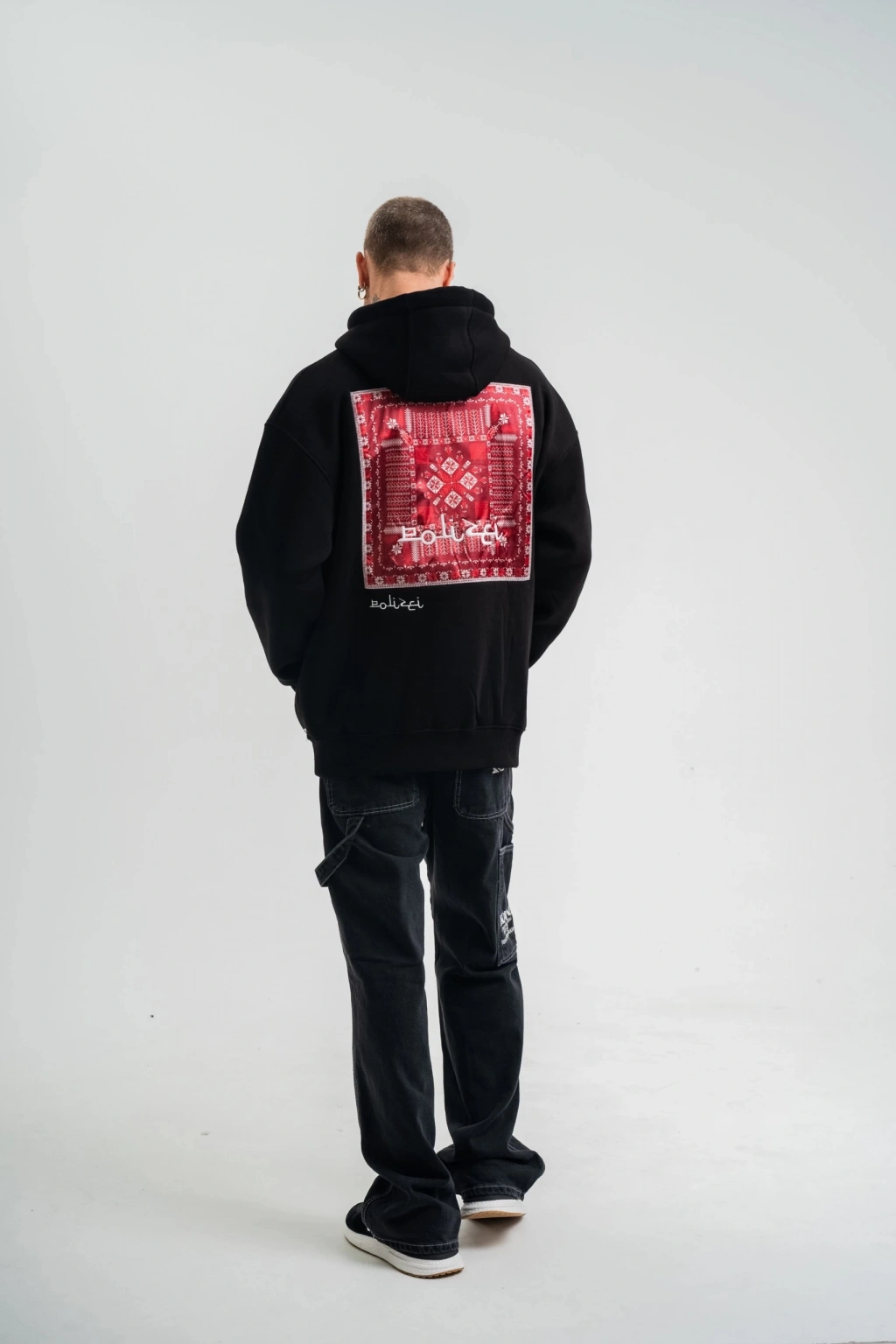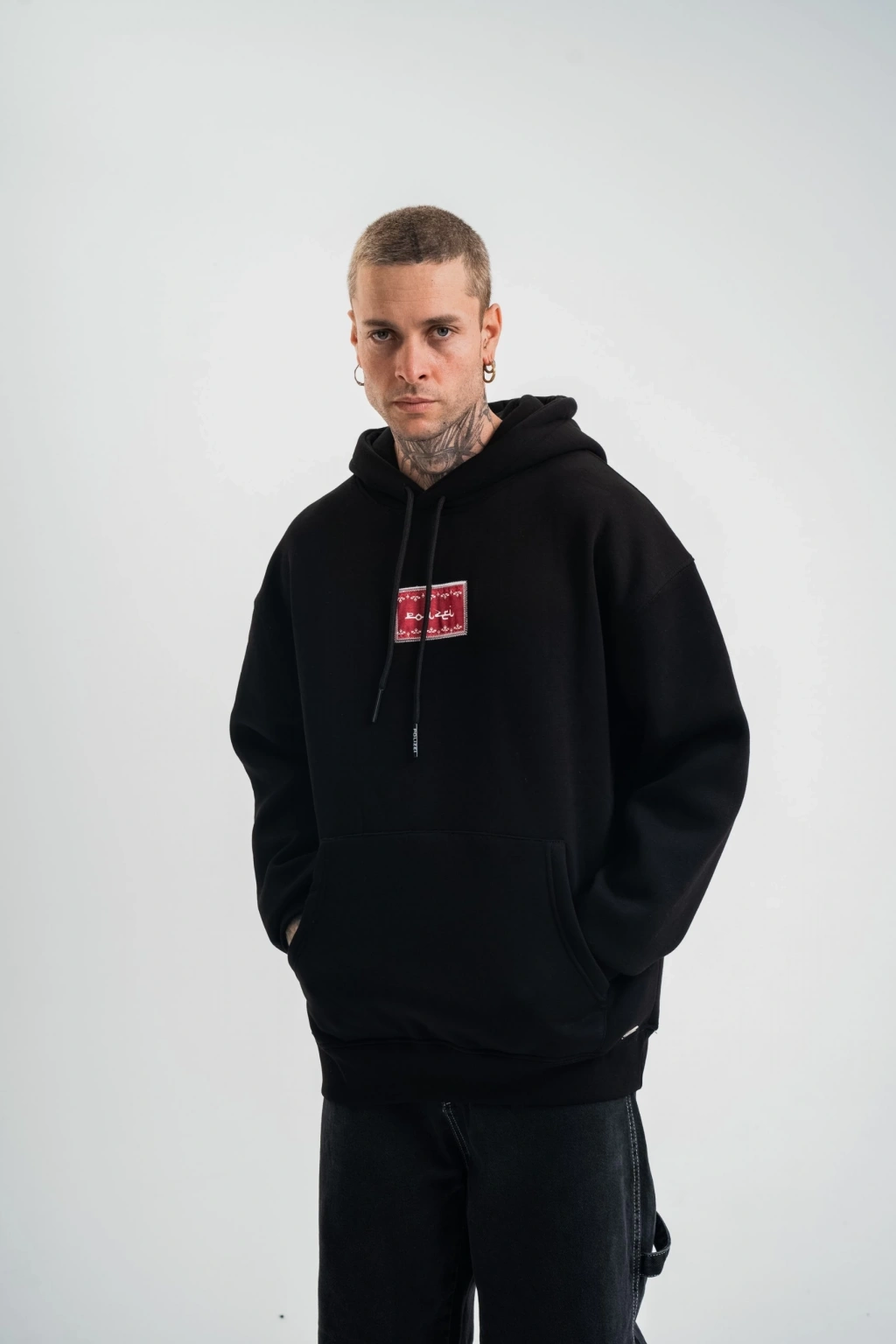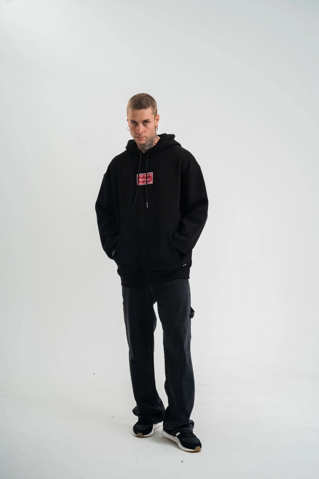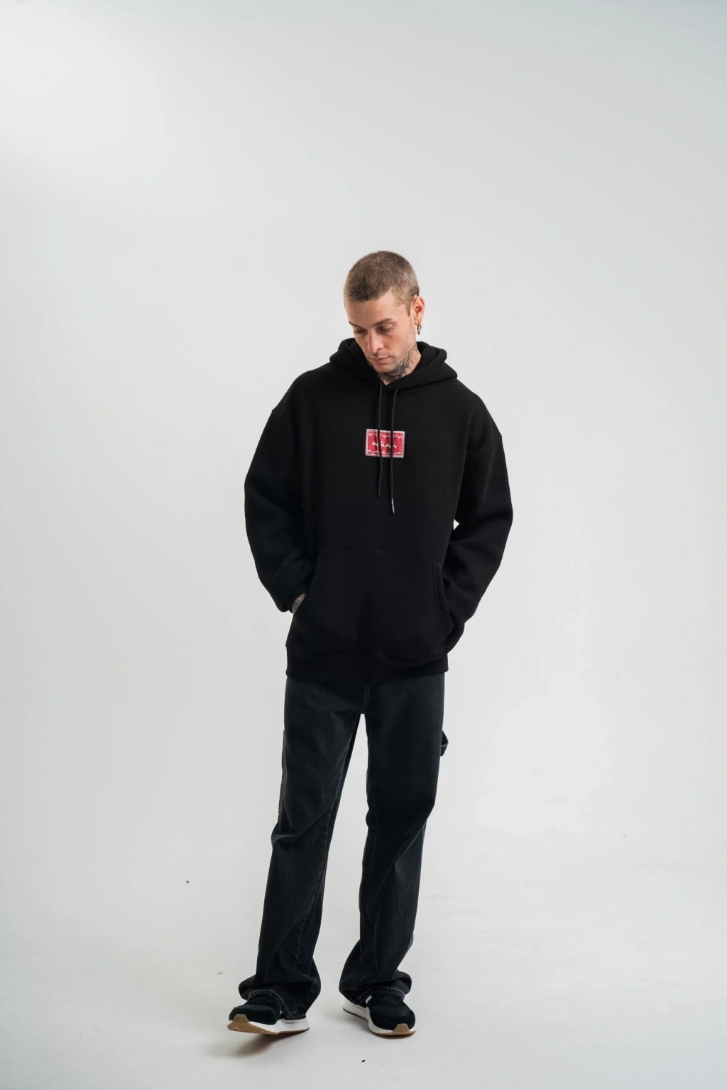 Erkek Oversize Üç İplik Kapüşonlu Sweatshirt – Siyah Sırt ve Ön Baskılı, Kanguru Cepli, Rahat Kalıp, İçi Pamuklu ModeL-Siyah