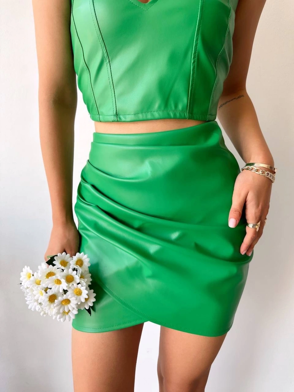Cep detaylı oval kapaklı deri etek yeşil h240048