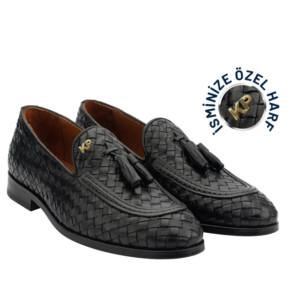 İsme Özel El Örgüsü Kösele Erkek Ayakkabı - %100 Hakiki Deri - Gümüş Konseptli - AA01010 - Siyah