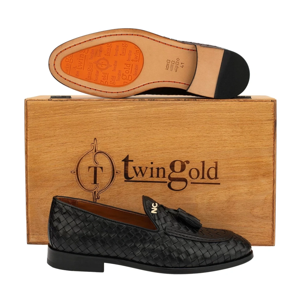 İsme Özel El Örgüsü Kösele Erkek Ayakkabı - %100 Hakiki Deri - Altın Harf - AA01002 - Siyah